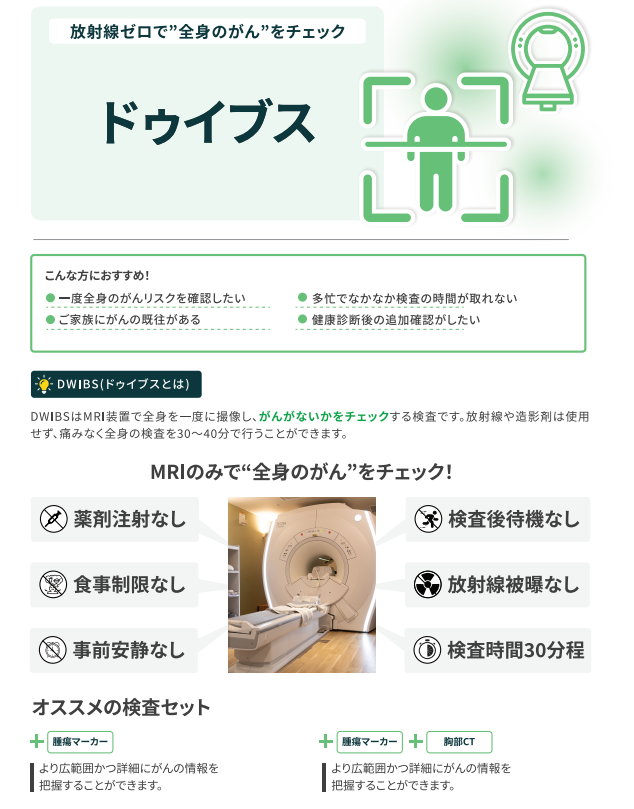 DWIBSはMRI装置で全身を一度に撮像し、がんがないかをチェックする検査です。